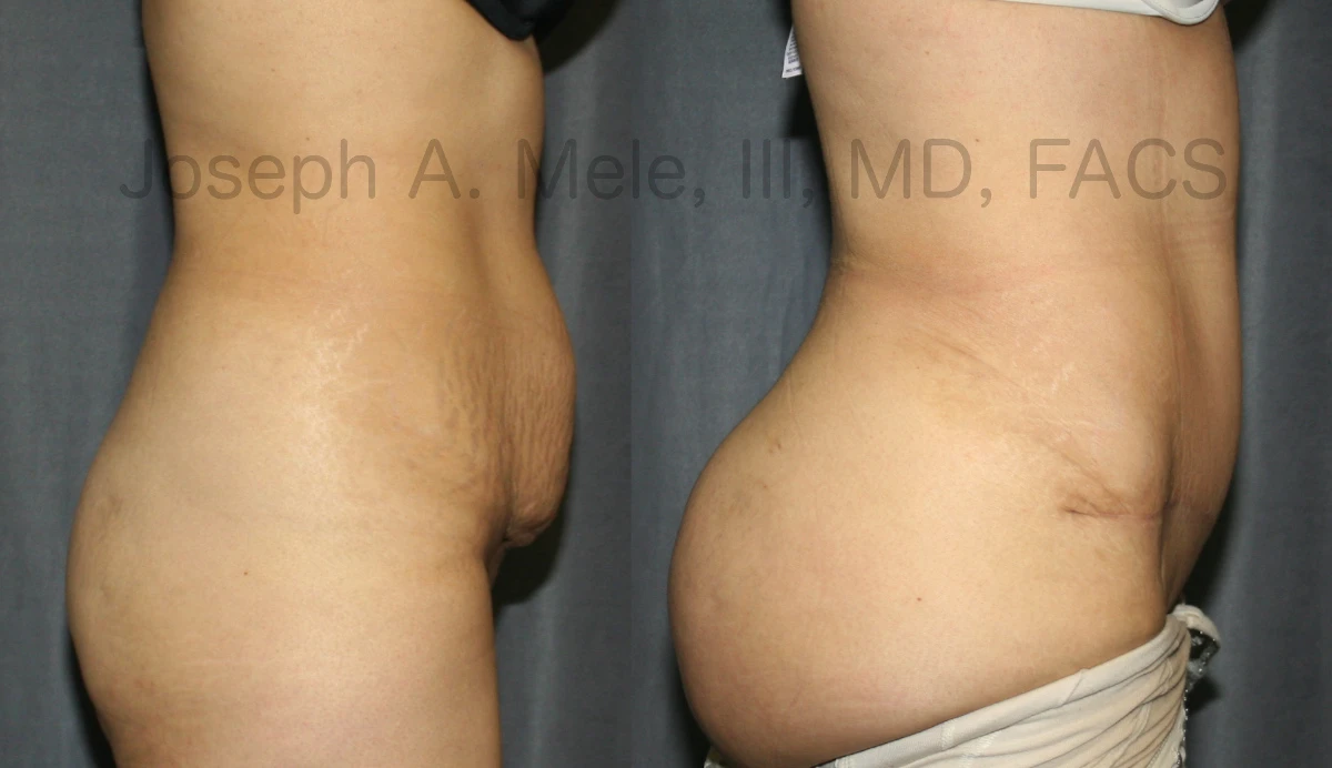 Abdominoplasty smooths the abdominal wall by tightening the muscles and removing excess skin and fat. In this case, fat from the belly was used to augment the curves of the buttocks with a BBL.