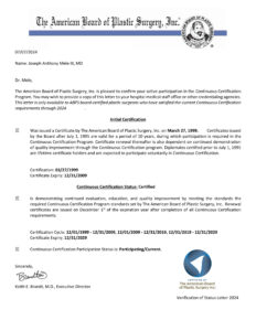 American Board of Plastic Surgery issues a letter every year to Board Certified Plastic Surgeons who maintain Continuous Certification.